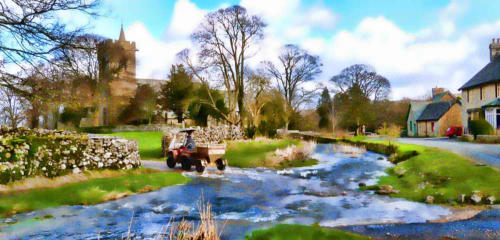 Ravensworth ford, an ATV returns from feeding ewes turnips in the winter fields.